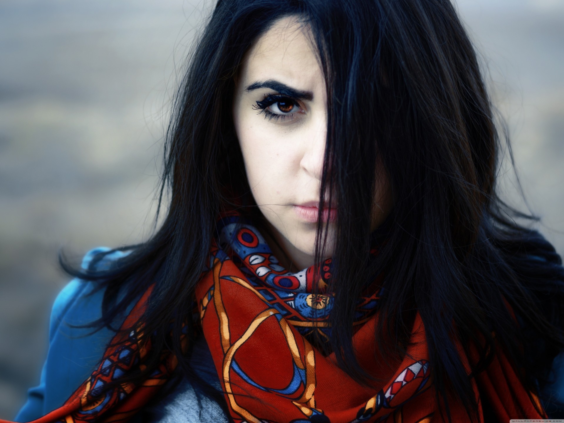 Чернобровная брюнетка с ярким шарфом - обои на рабочий стол